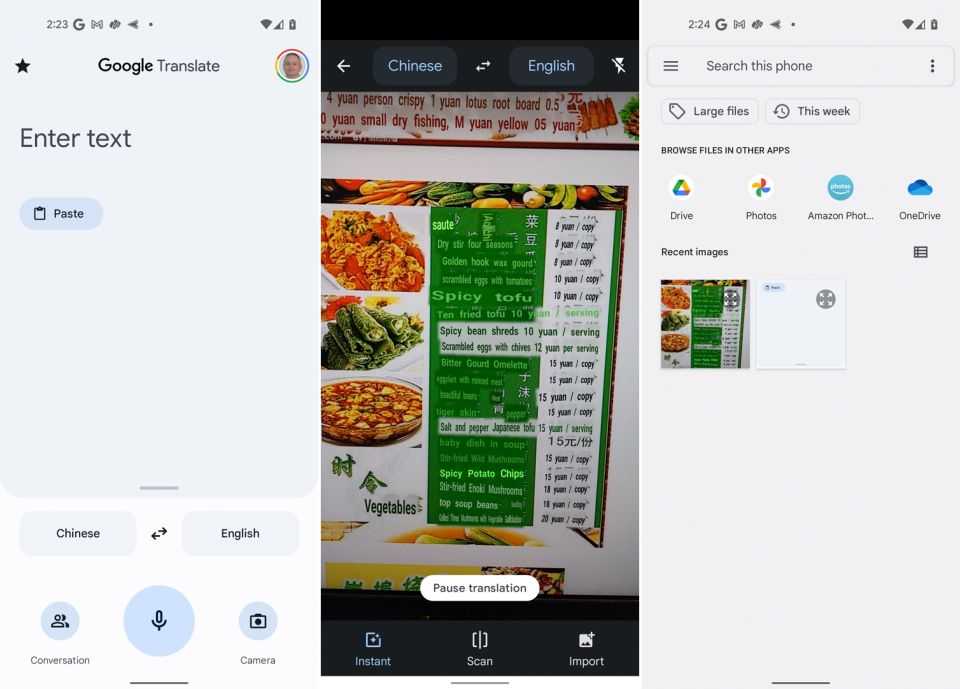 Ещё одной интересной возможностью является перевод текста с изображений, если направить на них камеру устройства. Переводчик Google обеспечивает перевод в реальном времени, хотя для некоторых языков придётся сначала скачать языковой пакет. Выберите, с какого языка и на какой переводить, потом нажмите на иконку камеры. Направьте камеру устройства на вывеску, меню или документ на непонятном вам языке. Когда приложение распознает текст, перевод появится поверх изображения и вы увидите его на экране.