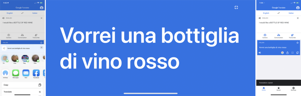 На iPhone нажмите на иконку «Поделиться», чтобы отправить этот перевод кому-то. Нажмите на иконку «Во весь экран» для отображения перевода в полноэкранном режиме. Нажмите на иконку «Копировать» для копирования перевода.