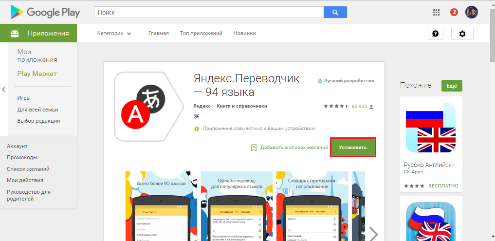 Как скачать и установить приложение «Яндекс.Переводчик» на смартфон или планшет через компьютер с официального сайта Google Play?
