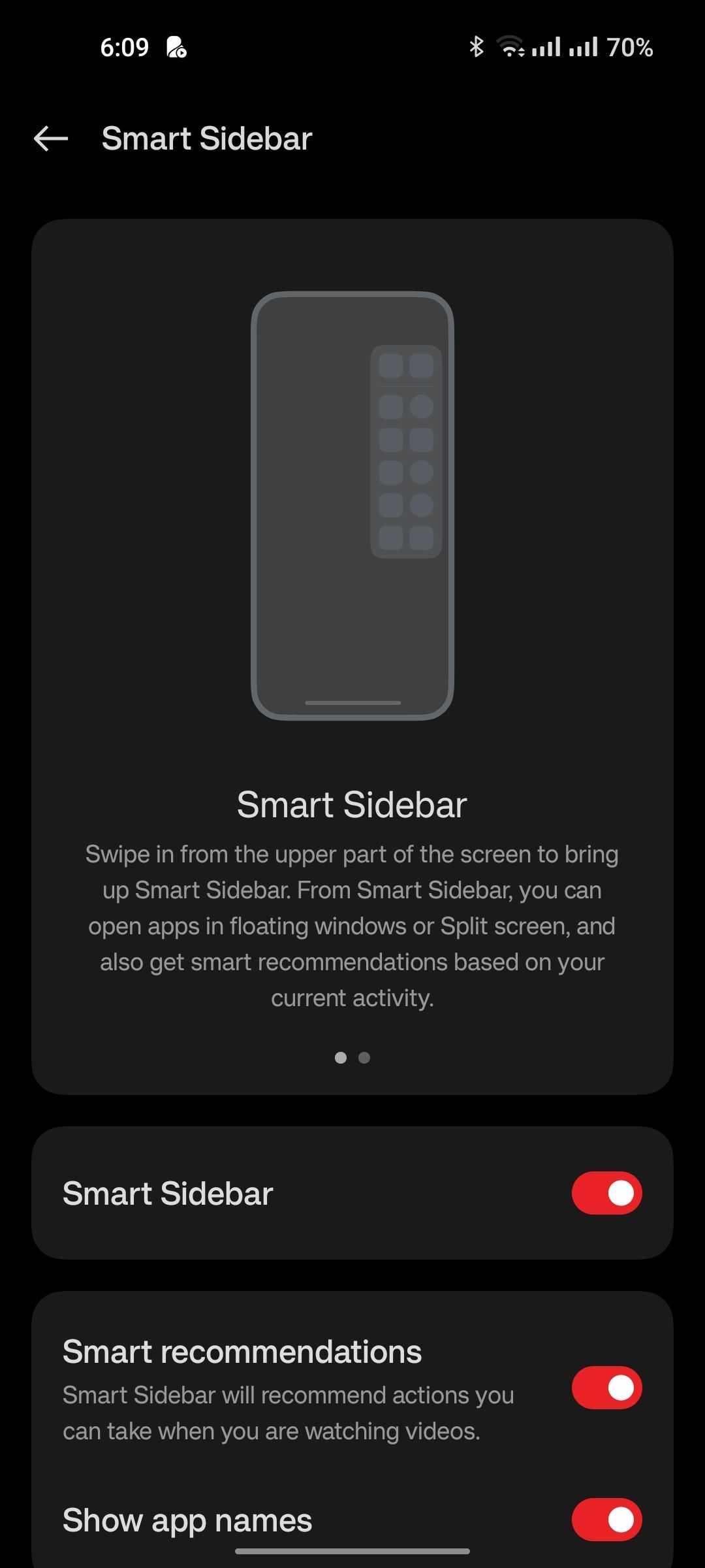 This all starts with the new ‘Smart Sidebar.’ Much like Samsung’s ‘Edge Panels,’ you can store apps here to make your most used apps most comfortable to grab with one hand. OnePlus allows you to store up to 16 apps, plus there are toggles to screen record or take a screenshot.