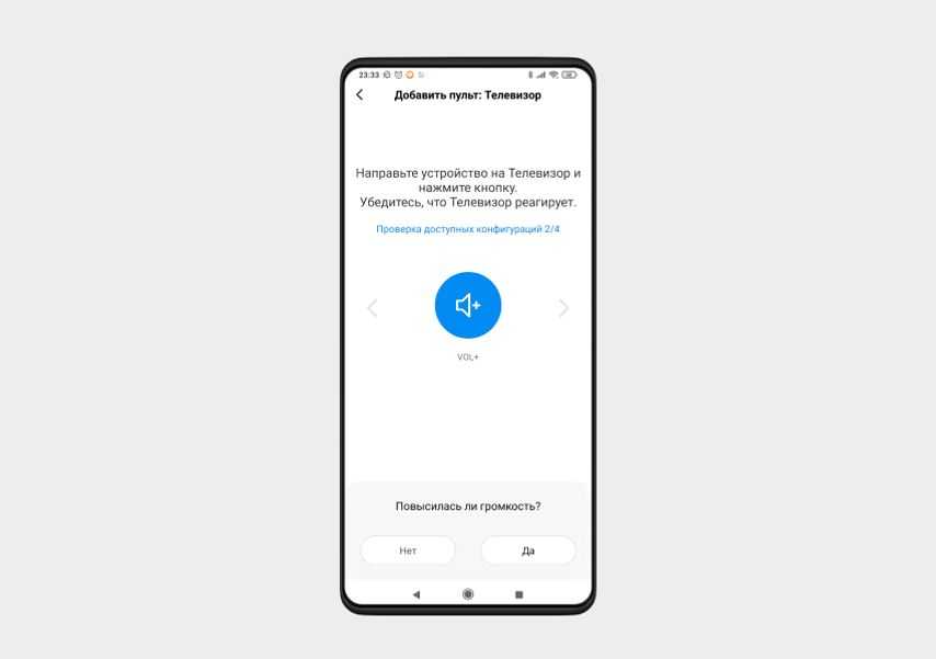 Приложение предложило повысить громкость. Если после нажатия на круглую синюю кнопку громкость на телевизоре увеличилась, подтверждаем. Если нет, выбираем «Нет», и приложение отправит новый сигнал.
