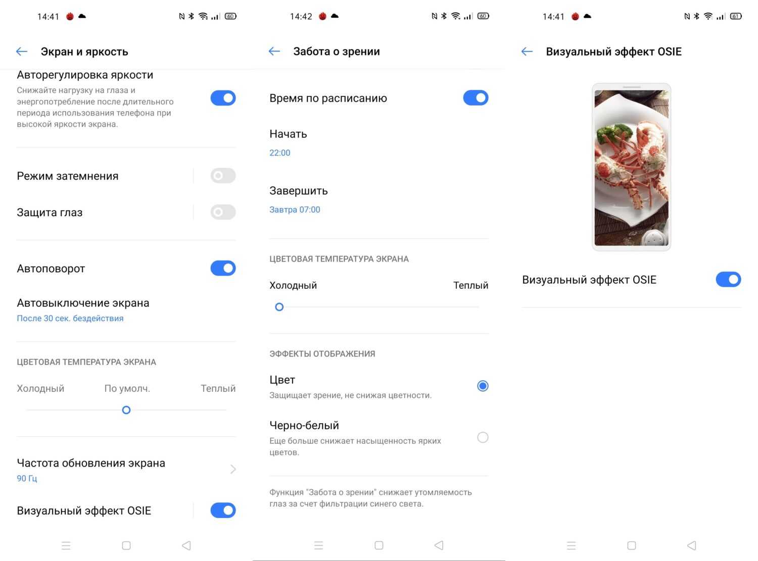 Режим защиты глаз при чтении в черно-белом и цветном исполнении, темный режим и какой-то загадочный “Визуальный эффект OSIE” можно включить и настроить в разделе “Экран и яркость”.