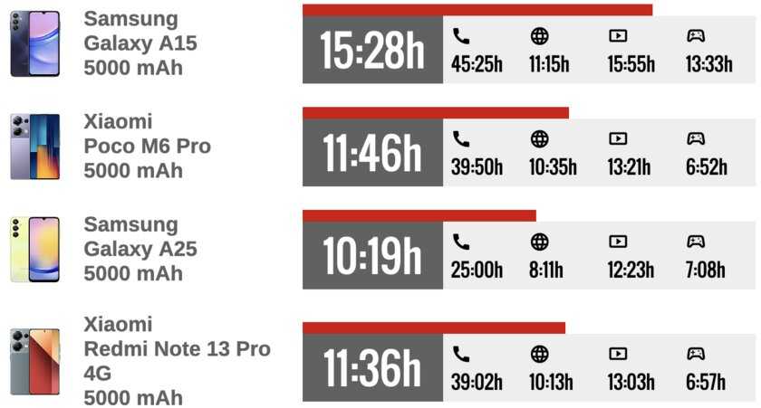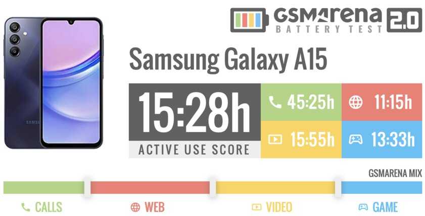 Galaxy A15 оснащен большим аккумулятором емкостью 5 000 мА⋅ч и энергоэффективным чипсетом. Поэтому мы надеемся, что время автономной работы будет отличное. Оно таким и оказалось! Galaxy A15 показал превосходный результат в режиме активного использования — 15 часов и 28 минут. Он хорошо справился со всеми нашими тестами, а в веб-серфинге и играх и вовсе блистал.