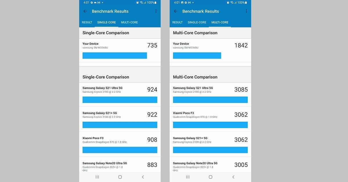 Demak, Galaxy A53 5G hamda Galaxy M33 qurilmalari bir turdagi chipsetga ega bo‘ladi. Avvalroq A53 5G ham GeekBench’da testdan o‘tgan edi. Agar ular qayd etgan natijalari taqqoslak, hech qanday katta farqni sezmaymiz.
