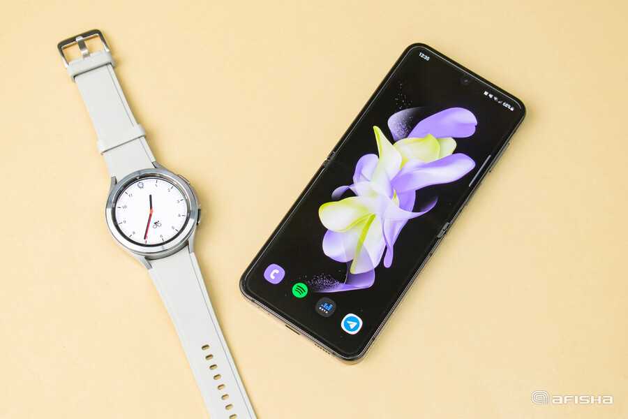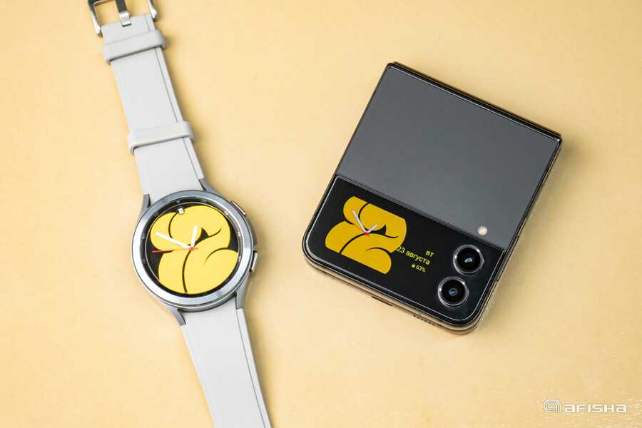 У Z Flip4 два экрана — гибкий, внутри, и вспомогательный, который находится рядом с камерами. Второй дисплей используется для быстрого доступа к управлению музыкой, прочтению уведомлений, просмотру погоды, календаря и запуску диктофона. Также с его помощью можно сделать селфи на основную или широкоугольную камеру.