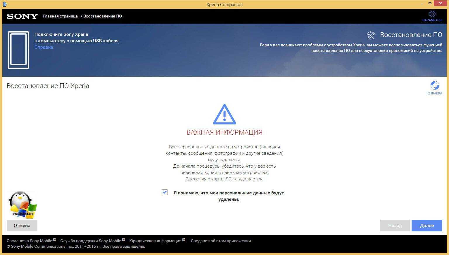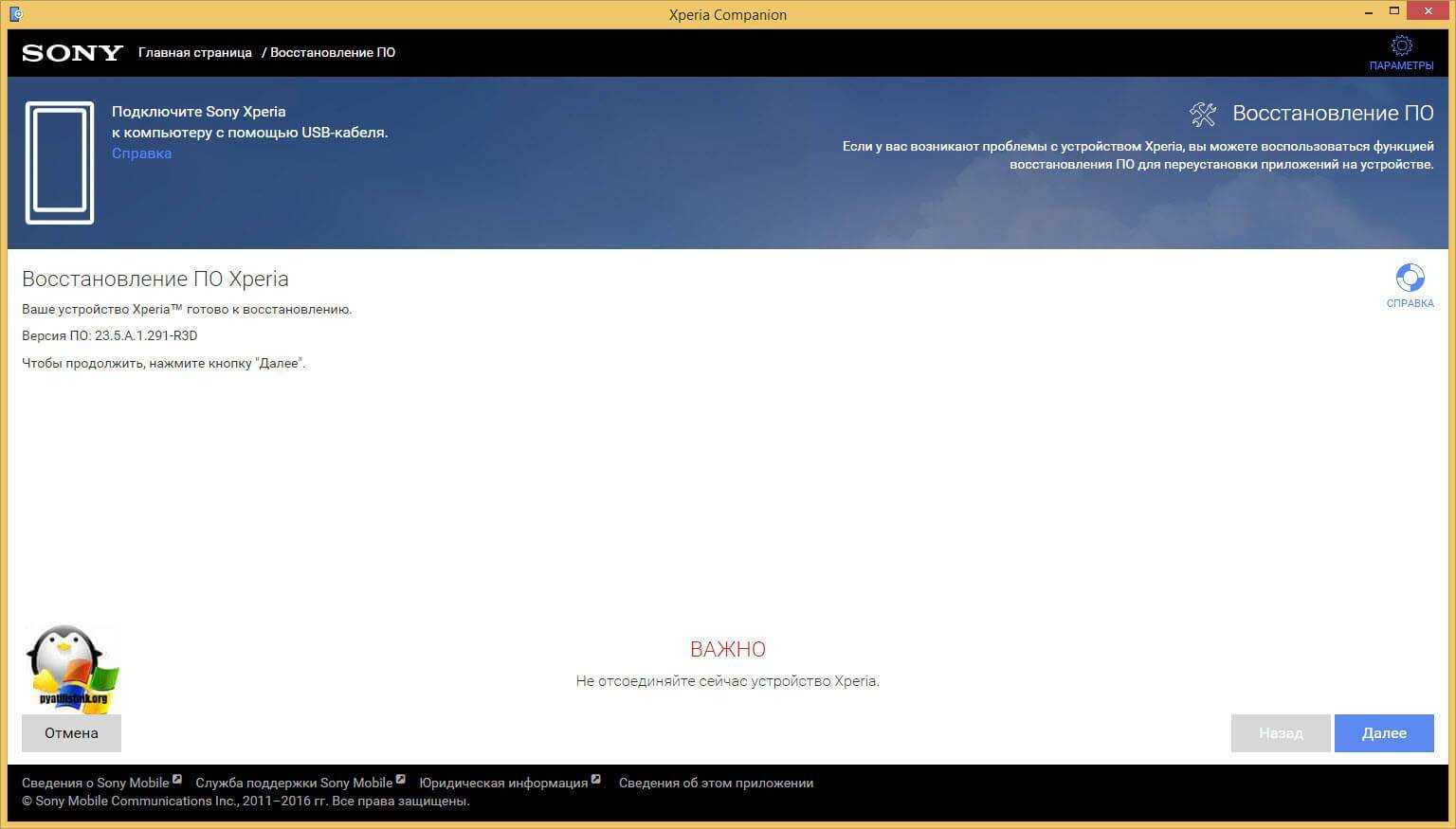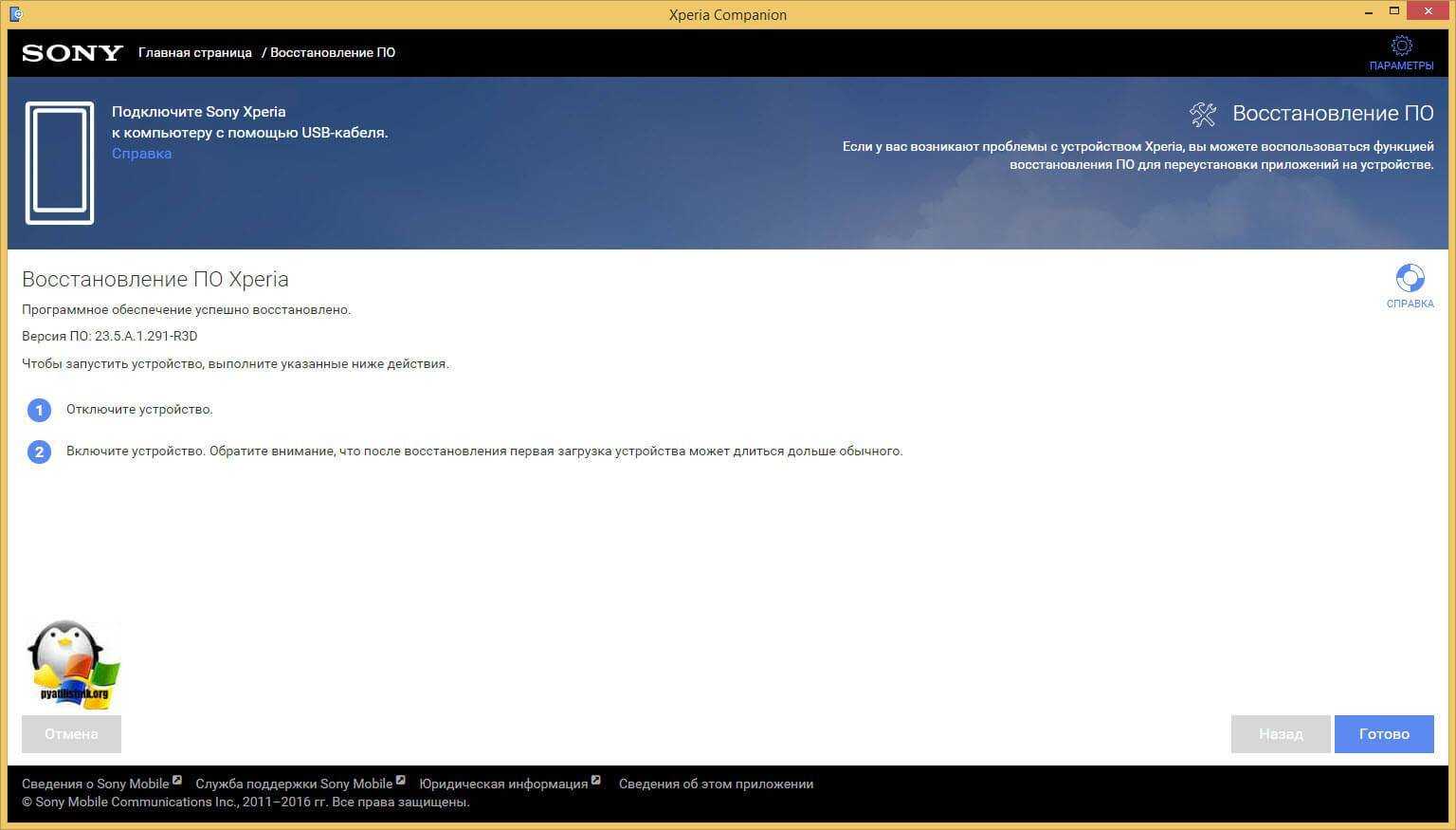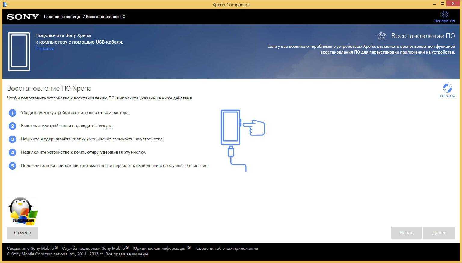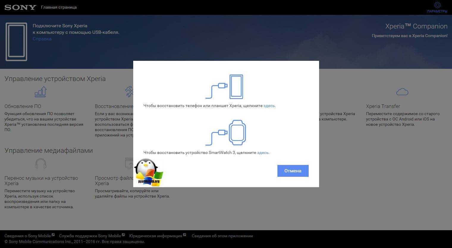 - Вы можете установить компьютер Sony. Сопутствующее программное обеспечение и выберите Зона поддержки> Обновление ПО телефона/планшета> Восстановить мой телефон/планшет .