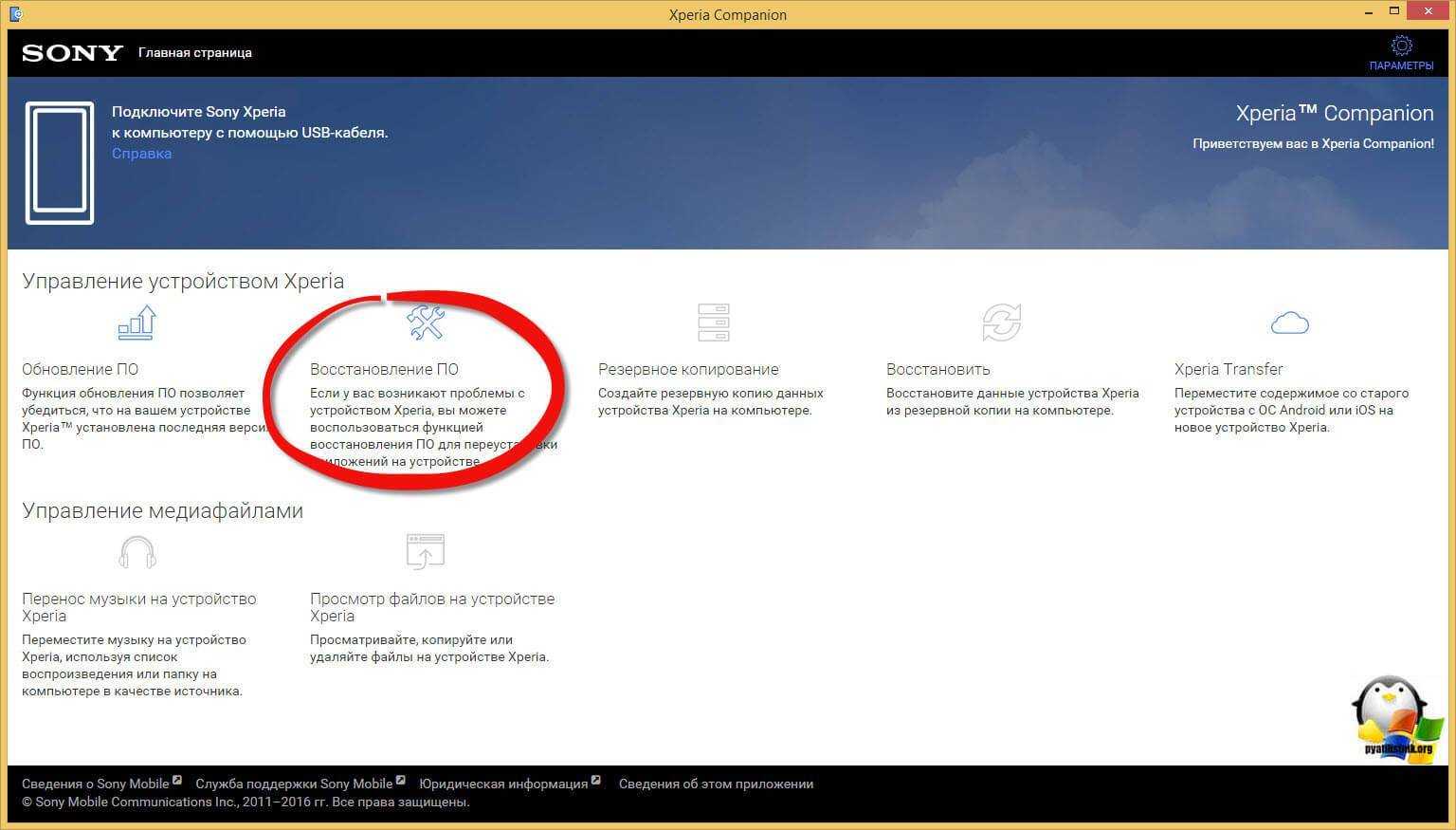 Открываем Xperia Campanion и находим пункт Восстановление ПО он как раз для таких целей и служит.