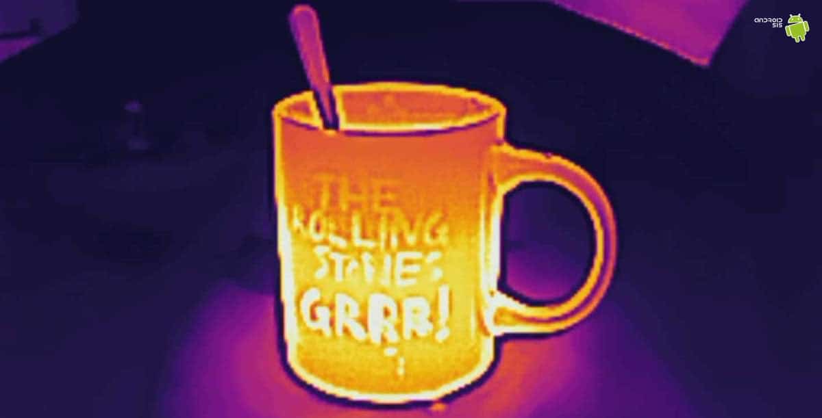 As well it is very curious to check the temperature of objects, or people around us. We can even configure the color in which we want the temperature to be represented, and various other settings. In this photo, we can see how the cup containing hot coffee appears fully illuminated due to its high temperature.