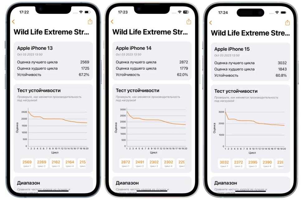 В 3D Mark в тесте “Wild Life Extreme” лучшую устойчивость показал iPhone 13. Но стоит понимать, что он и выдавал меньшую частоту кадров. Оценка лучшего и худшего цикла ниже, плюс он потерял больше всех заряда батарейки. iPhone 14 держался достойно, но очевидно, что iPhone 15 стал лидером в этой тройке.