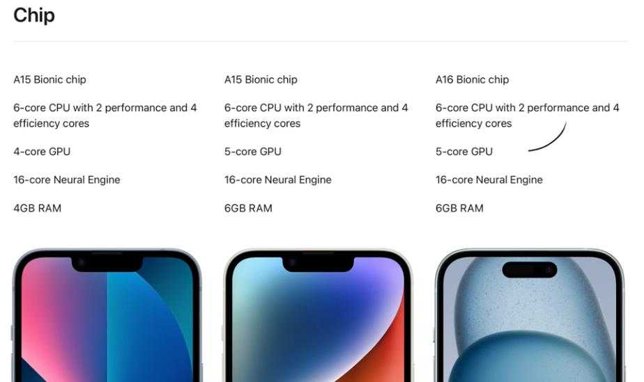 iPhone 15 получил более продвинутый чип A16 Bionic (4 энергоэффективных и 2 производительных ядра), пять графических ядер и 6 Гб оперативки, как и в iPhone 14.