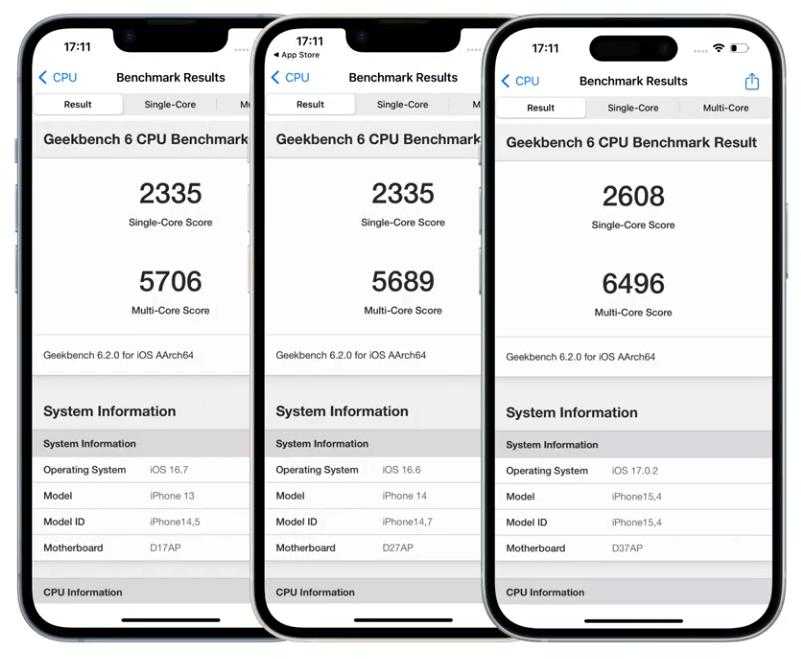 Чем больше оперативки и чем новее чип, тем лучше. Но что покажут тесты? В Geekbench 6 результаты вполне ожидаемые. iPhone 13 и iPhone 14 в одноядерном и многоядерном тесте практически идентичны, что логично – чипы то одинаковые. А iPhone 15 за счет чипа A16 Bionic показывает результат получше.
