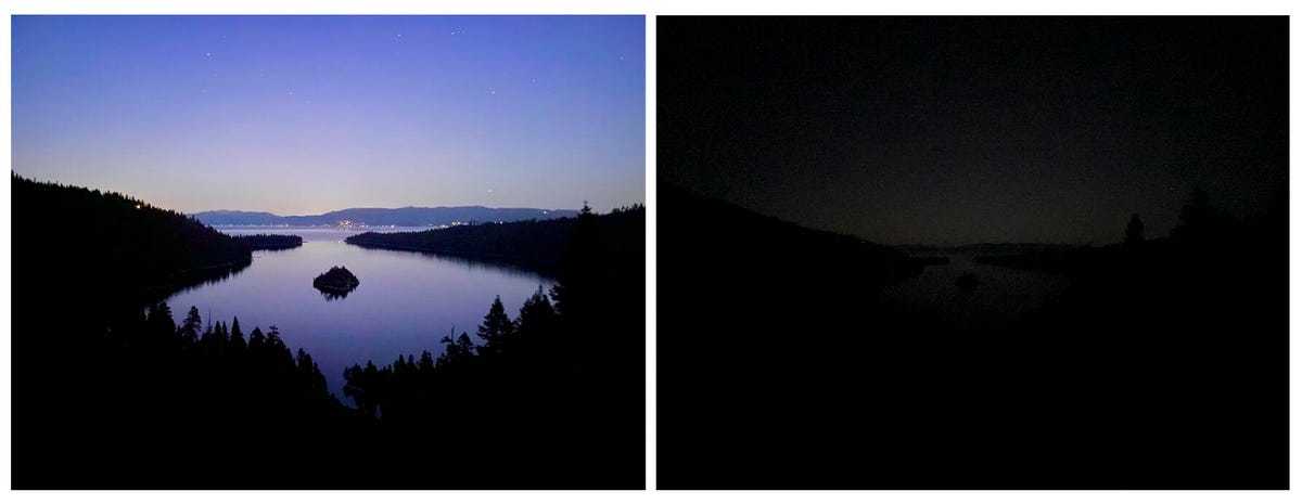 An iPhone 12 Pro 30-second Night Mode exposure on the left, and the iPhone 11 Pro without Night Mode on the right.