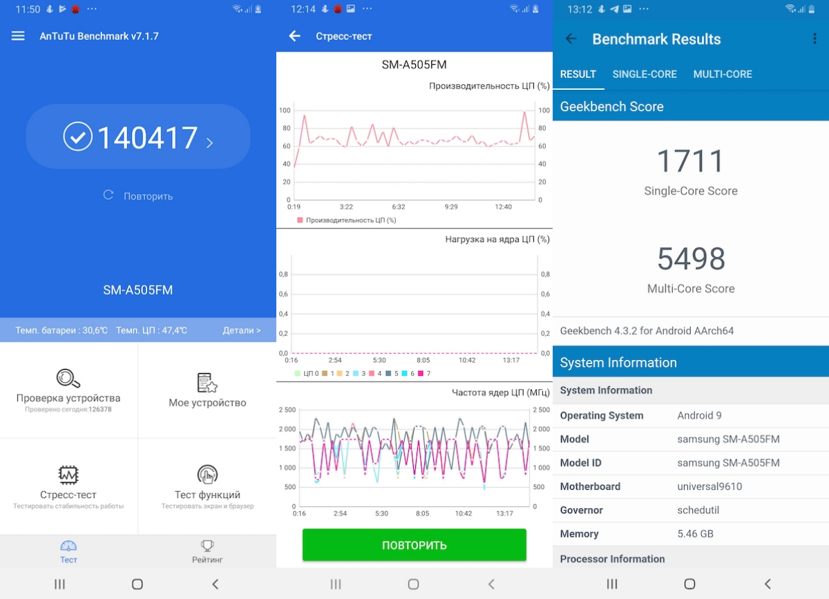 Samsung Galaxy A50 оснащен чипсетом Exynos 9610. Разработанный Samsung, собственный чип основан на 10-нм техпроцессе FinFET и включает восьмиъядерные ядра, разделенные на два четырехъядерных кластера. В то время как один кластер имеет ядра Cortex-A73 с тактовой частотой 2,3 ГГц, в другом кластере все процессоры Cortex-A53 работают на частоте 1,7 ГГц. Чипсет в сочетании с графическим процессором Mali G72MP3 соответствует высоким графическим требованиям. Galaxy A50, который у нас был на тесте, имеет 4 ГБ оперативной памяти и 64 ГБ памяти, также есть версия 6+128.