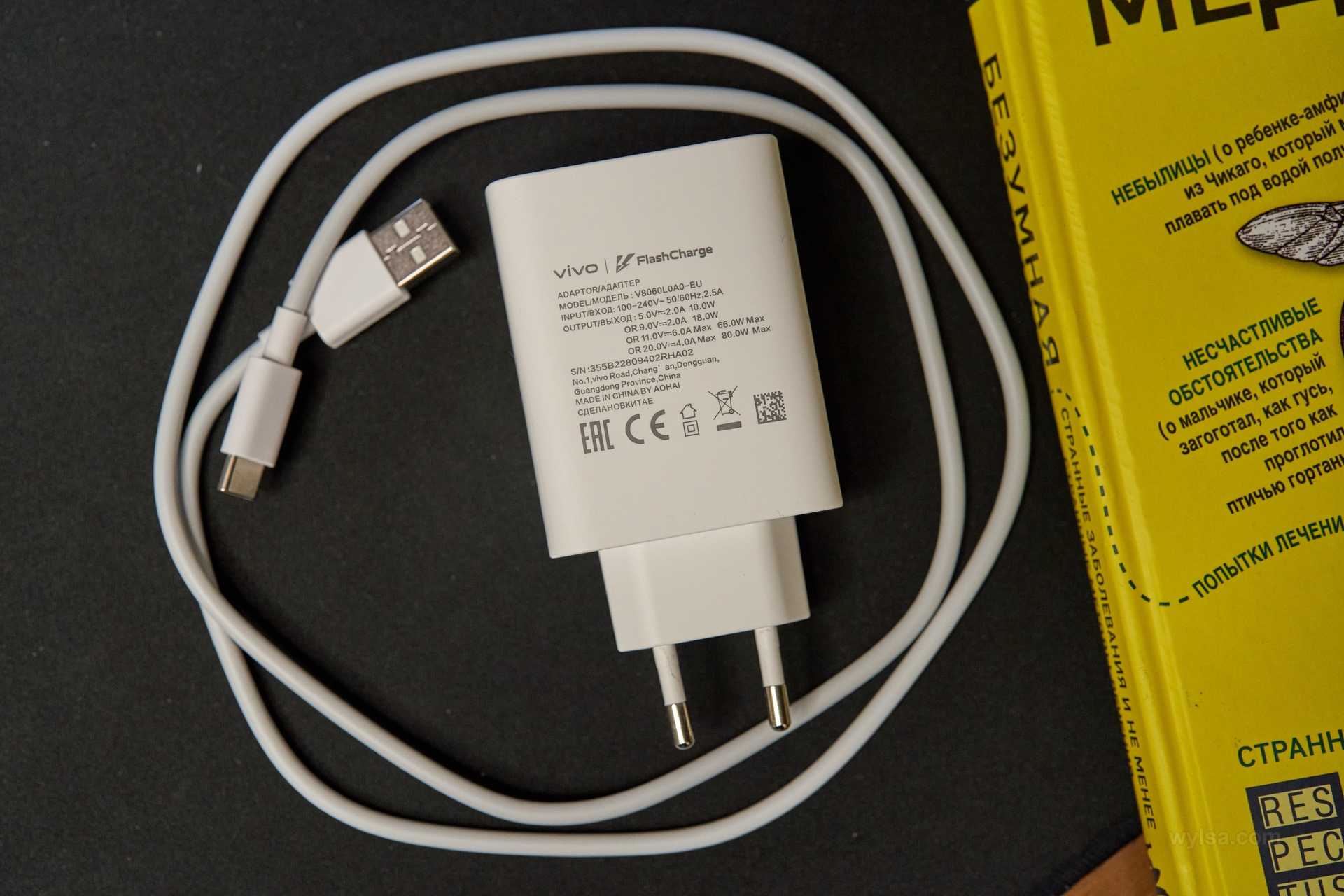 Комплектный адаптер питания достаточно крупный, но при этом с весьма быстрой зарядкой vivo FlashCharge. От 0 до 50 % за двадцать минут — достойный результат. На полную зарядку требуется меньше часа. Если привести примеры расхода батарейки в тестах, то час игры съедает около 15-18 %, а просмотр потокового видео на среднем уровне яркости по Wi-Fi требует около 3-5 %.