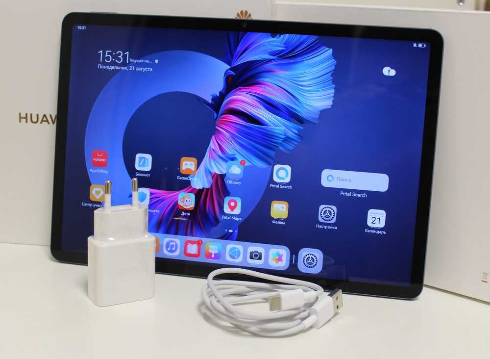 Комплект поставки планшета стандартен для Huawei. Девайс упакован в коробку из жёсткого картона белого цвета. На верхнюю часть золотистым шрифтом нанесено название модели. В коробке помимо самого устройства имеется несколько дополнительных отсеков. В них располагается кабель USB Type C для синхронизации и зарядки (длина примерна 1,5 м), адаптер для электросети мощностью 22,5 Вт, переходник USB Type C – 3,5 аудиоразъём (планшет не имеет стандартного отверстия для подключения проводных наушников), отмычка для лотка карты памяти microSD, инструкция и гарантийный талон.