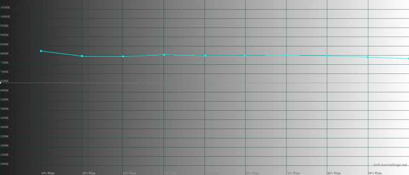 vivo Y35, цветовая температура в стандартном режиме. Голубая линия – показатели vivo Y35, пунктирная – эталонная температура