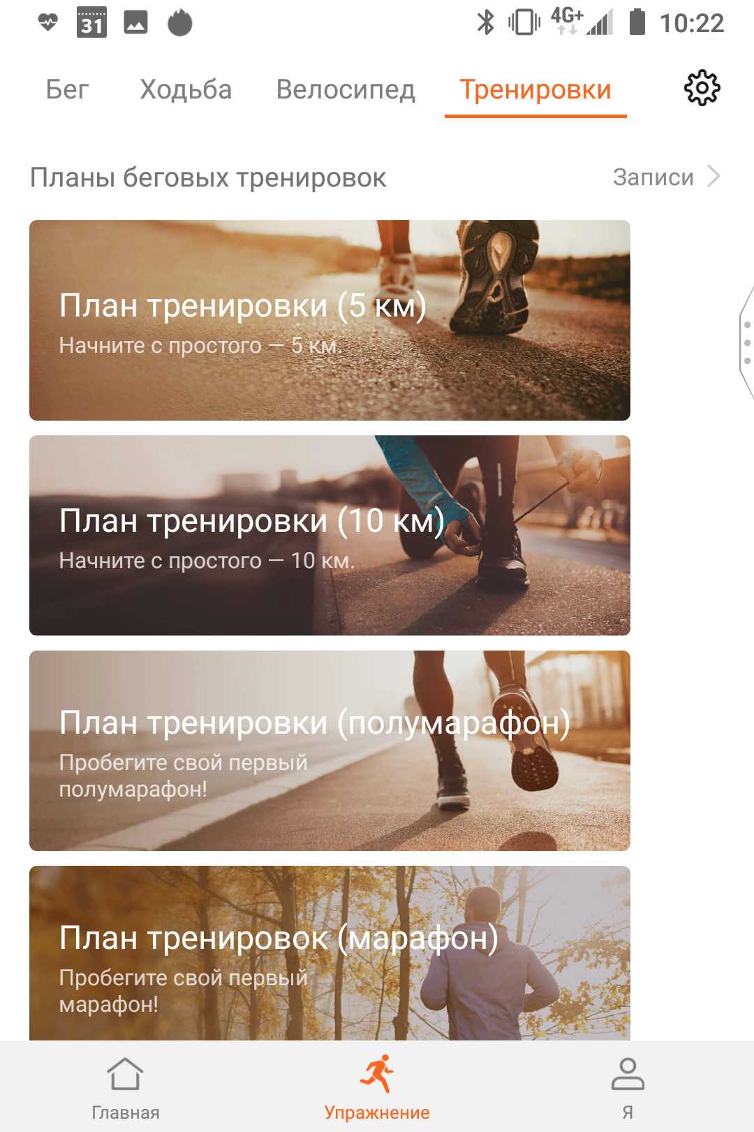 Набор типов тренировок у Watch GT немного шире, есть «Подъём» и «Кроссовый бег», которых нет на браслете. Еще, софт часов предлагает «Курсы бега», чего также нет на Bаnd 3 Pro. И тот, и другой девайс поддерживают следующие тренировки: бег на улице, беговая дорожка, ходьба на улице, езда на велосипеде, велотренажёр, плавание в бассейне, плавание в водоёме, «другое».