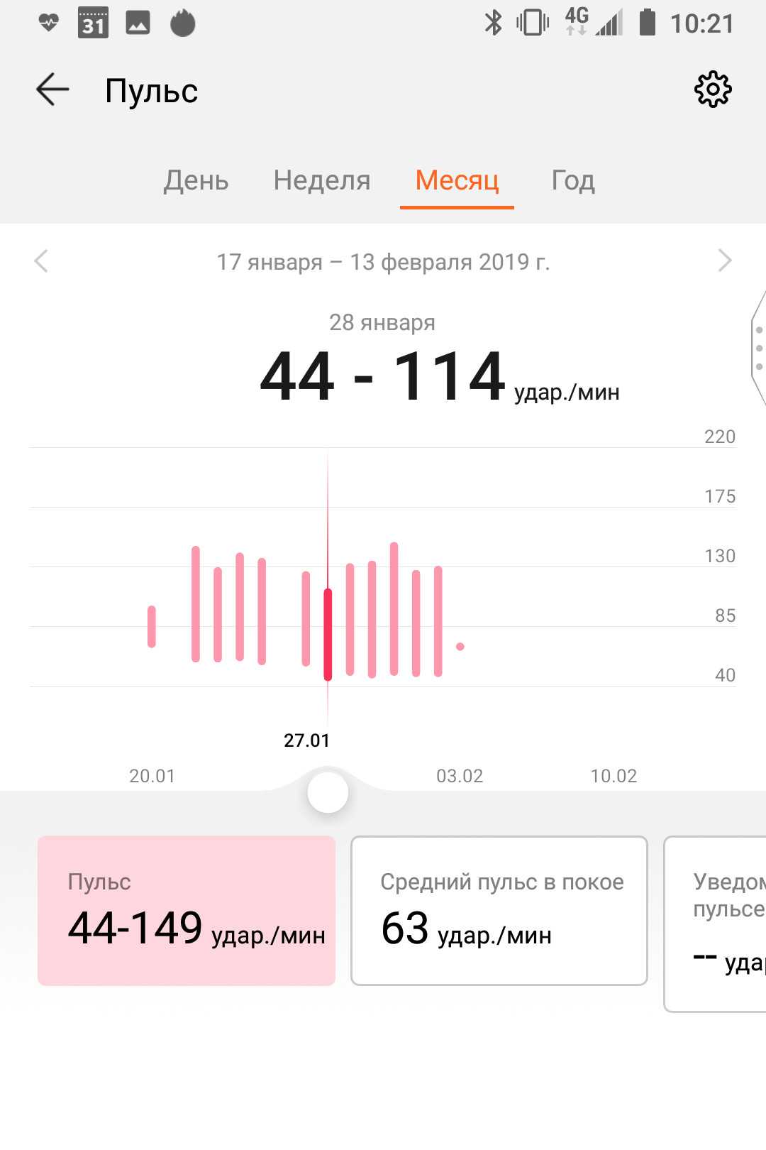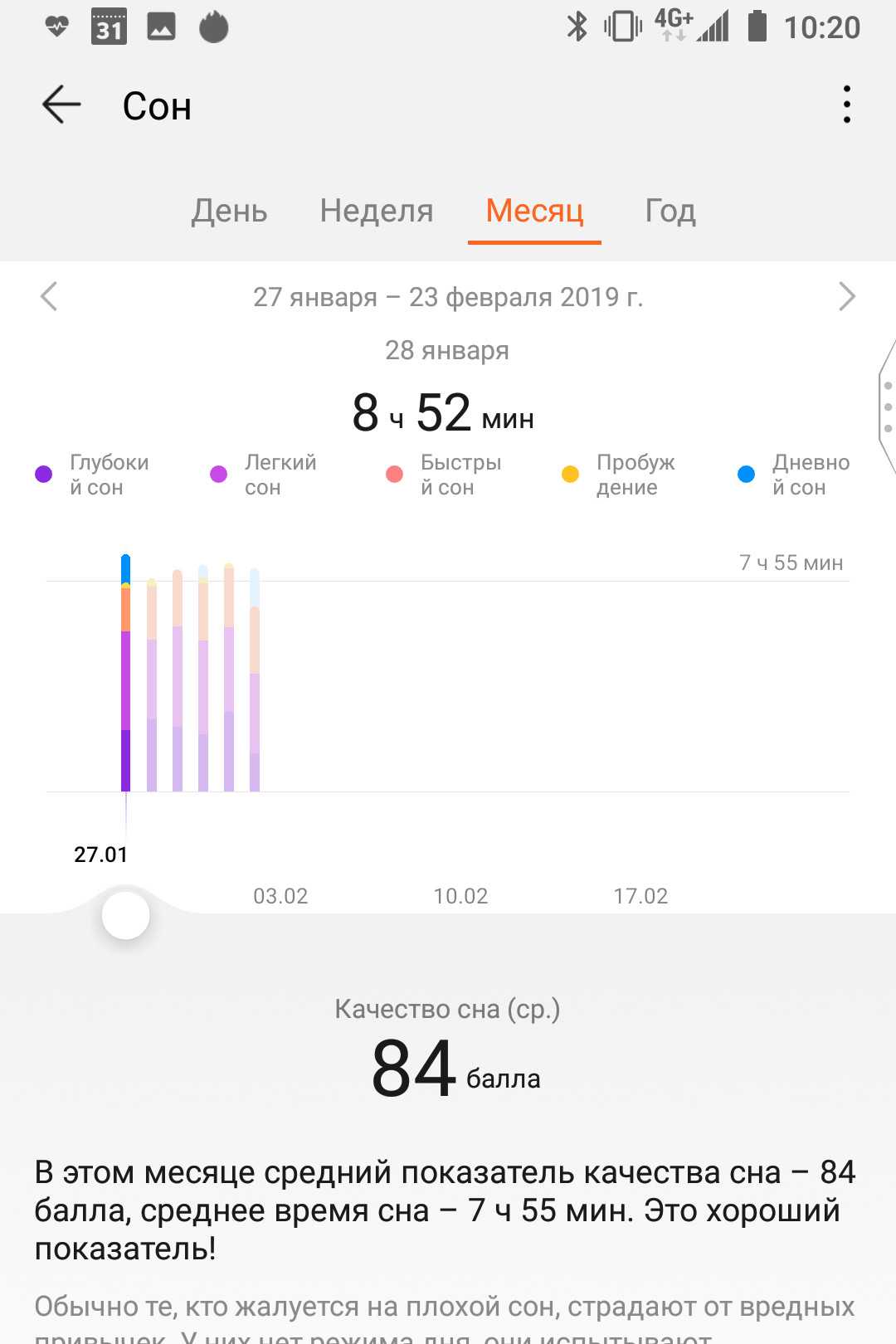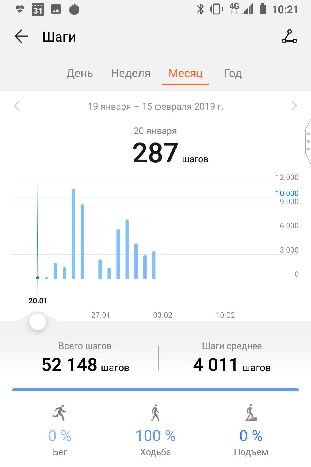 Очень важным аспектом для фитнес-трекеров является точность датчиков. К сожалению, никакого эталона для проверки этого показателя у меня нет – я могу только сравнивать данные Watch GT с данными Band 3 Pro. Я старался следить за тем, чтобы у меня на руках были или оба гаджета, или ни одного из них, чтобы данные касались одних и тех же периодов времени и подлежали сравнению. В результате могу сказать, что замер пульса у меня особых сомнений не вызывает – 63 среднем у Watch GT и 65 у Band 3 Pro. При одновременных замерах разница обычно была в пределах 2-3 ударов (на браслете надо дождаться окончания замера, поначалу данные очень неточные). А вот шаги фиксируются не так хорошо: за всё время тестирования Watch GT насчитали 52 148 шагов, а Band 3 Pro – всего 46 148. Причём в некоторые дни больше шагов было на часах, а в некоторые – на браслете. Кроме того, Band 3 Pro зафиксировал на 17 минут в день больше сна, чем Watch GT.