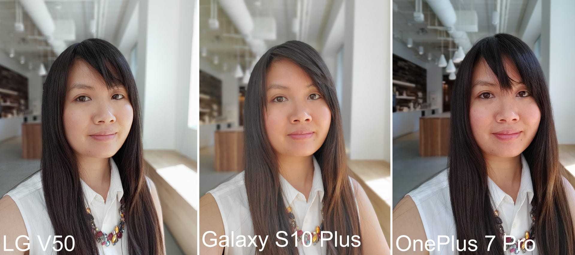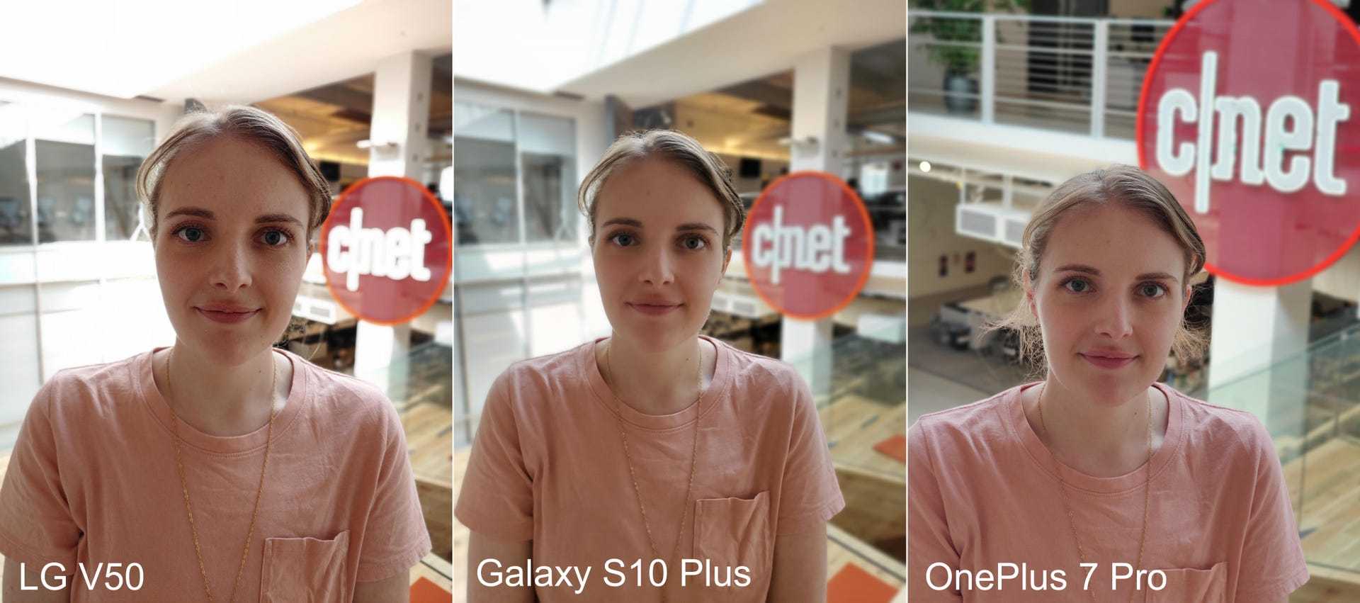 On the front is an 8-megapixel standard camera and a 5-megapixel wide-angle lens. Portrait photos with the rear camera looked clear, and the smooth fallout between the fore- and background looked as smooth across all three devices. As for portrait shots with the front camera, I preferred the OnePlus 7 Pro. Details like skin and hair were sharper. But skin tone on the V50 looked more natural than on the Galaxy S10 Plus, which looked too washed-out and orange.