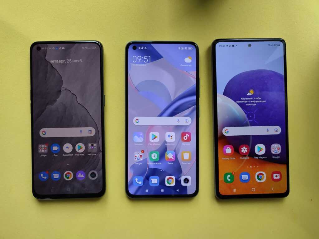 По уровню яркости, несмотря на заявленные 1000 нит у realme по факту получаем до 850 нит при включенной автоматической регулировке яркости на смартфонах Samsung и Xiaomi, и до 700 нит на Realme. Но в любом случае у всех троих с читаемостью текста даже на ярком солнечном свете никаких проблем нет.