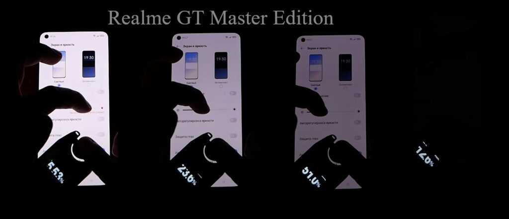 Безупречным лидером в этом плане является realme GT Master Edition, который “выдает” на максимуме всего 5 %, на среднем уровне до 20 % и опустившись чуть ниже получаем до 50 %, которые “на минималках” снижаются до 12-ти %. Плюс ко всему в смартфоне есть DC Dimming с включением, которого уровень ШИМ снижается еще больше.
