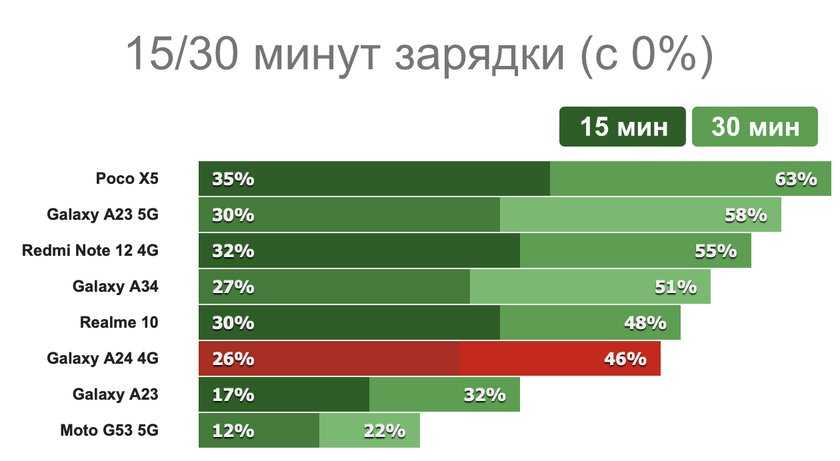 Мы использовали этот адаптер для нашего теста зарядки, и он показал неплохие результаты. A24 4G зарядился с 0% до 26% за 15 минут и до 46% за полчаса.