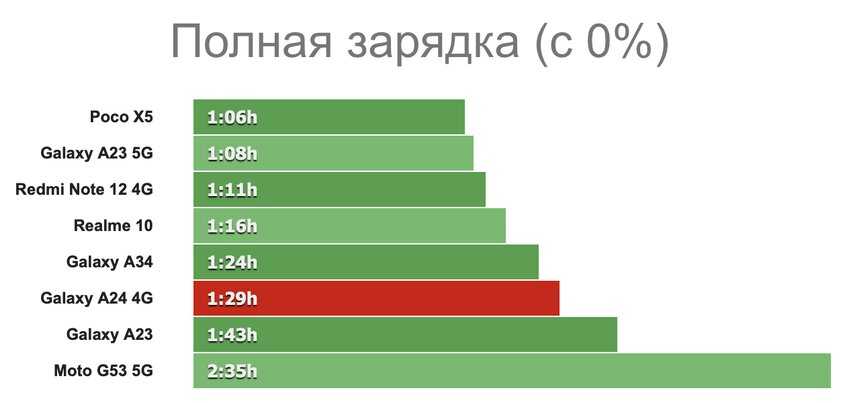 Galaxy A24 4G питается от аккумулятора емкостью 5 000 мАч — обычная емкость для многих других бюджетных Galaxy. Герой обзора продемонстрировал отличный показатель выносливости — 141 час. Он прекрасно справился с экранными тестами, а также с тестом на звонки. Потребление в режиме ожидания также было довольно экономным.