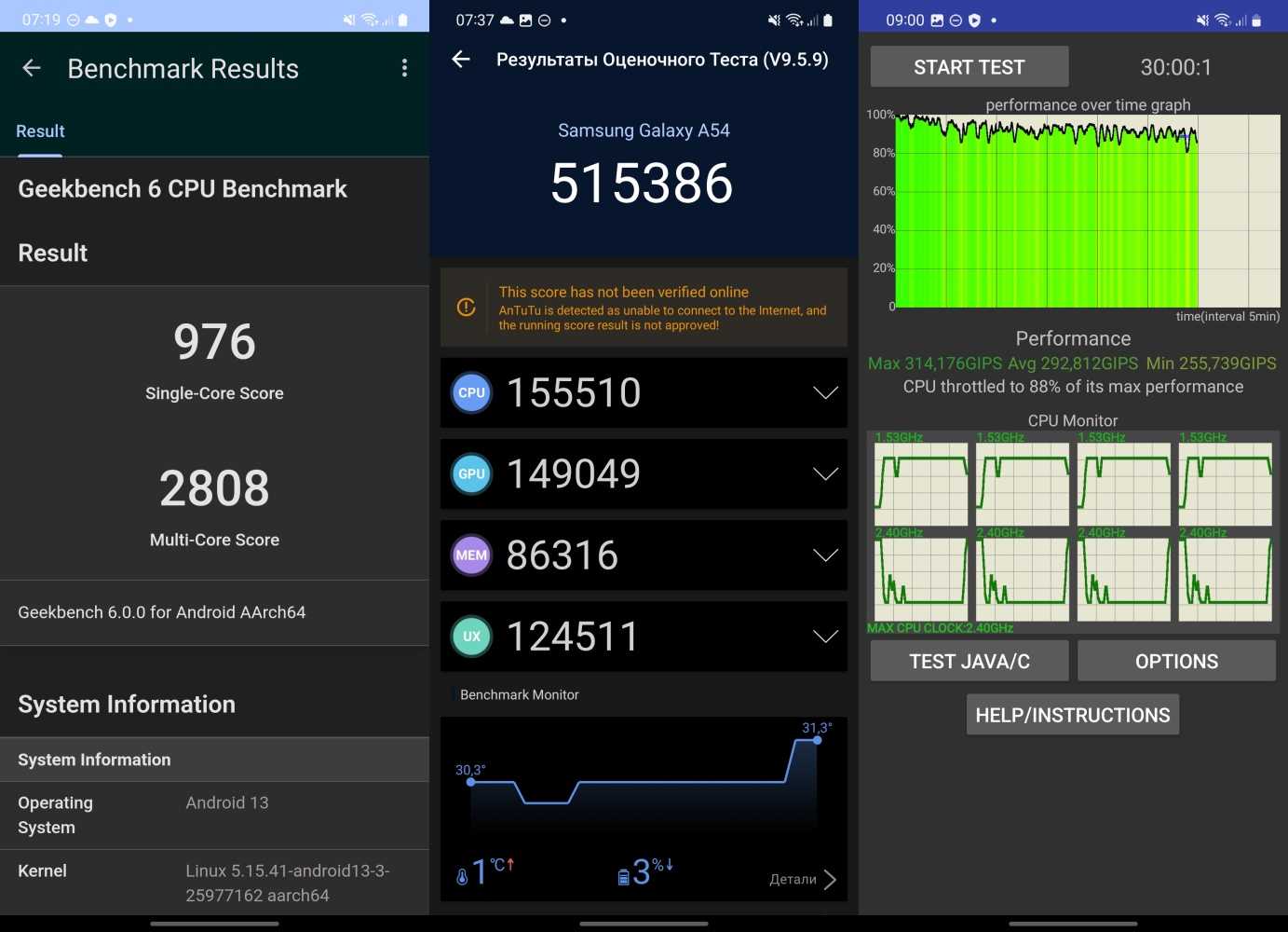 Galaxy A54 оснащен новым чипом Exynos 1380, который заметно мощнее, чем чип Exynos 1280 на Galaxy A53. Фактически, первый показывает общий балл AnTuTu (v9) более 500 000, тогда как последний может набрать только 379 313 баллов, что указывает на почти 30-процентное улучшение производительности.
