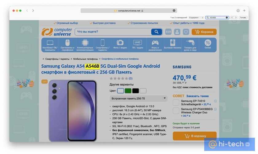 Есть три варианта. Перый: заказывать Galaxy A54 с иностранных магазинов и смотреть на версию смартфона. Например, Hi-Tech Mail.ru обнаружил Galaxy A54 (A546B) в немецком магазине (оставляем ссылку тут). Там он стоит 470 евро или 41 000 рублей. Конечно, этот способ не всем понравится, так как, согласитесь, «бюджетник» Samsung не стоит таких усилий, рисков и времени ожидания доставки из ЕС.