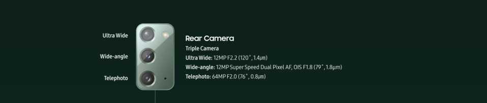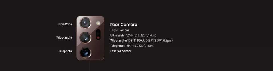 Оба телефона оснащены тремя объективами задней камеры с одинаковым 108-мегапиксельным широкоугольным объективом, дополненным 12-мегапиксельным телеобъективом и 12-мегапиксельным сверхширокоугольным объективом в случае Note 20 Ultra. S20 Ultra, с другой стороны, включает 48-мегапиксельный телеобъектив и 12-мегапиксельный сверхширокоугольный объектив. Этот телеобъектив большего размера позволяет S20 Ultra предлагать 100-кратное увеличение, в отличие от 20-кратного увеличения Note 50 Ultra.