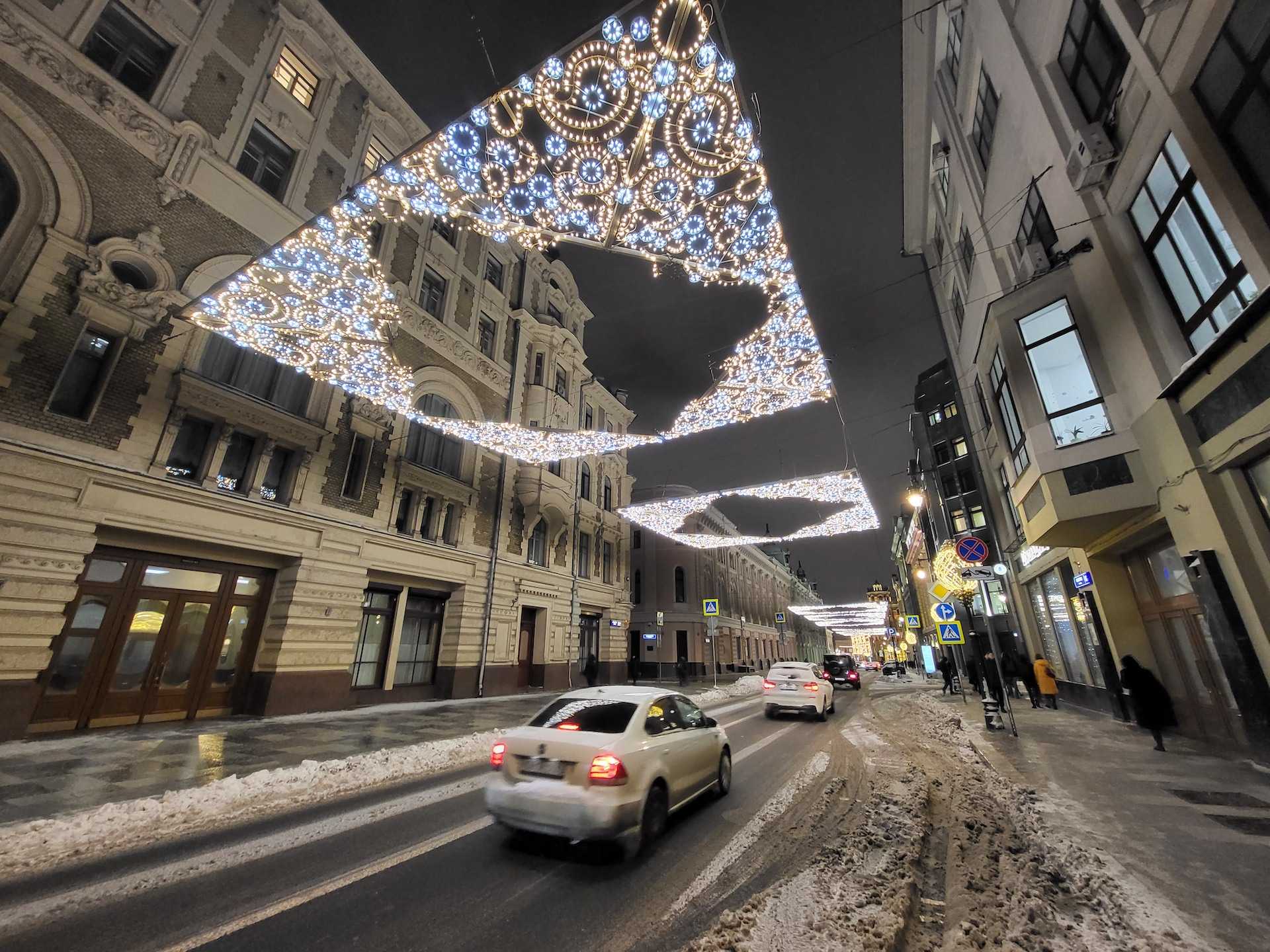 Ночью тоже получаются красивые кадры — я бы только небо затемнил, но это уже вопрос постобработки. Снег отливает желтизной, но это из-за внешнего освещения
