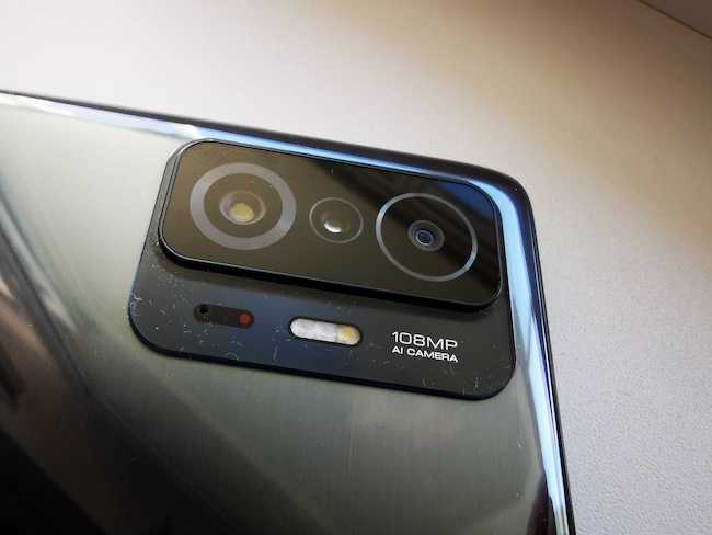 Для фото и видеосъёмки предусмотрена тройная основная камера, расположившаяся на тыльной стороне Xiaomi 11T. Главный модуль на 108 Мпикс. Он получил Nona Bayer-сенсор Samsung ISOCELL HM2, в котором субпиксели объединены не по четыре, как в Quad Bayer, а по девять. Размер матрицы — 1/1,52″, отдельные пиксели 0,7 мкм. Модуль комплектуется объективом со светосилой f/1,9 и эквивалентным фокусным расстоянием 26 мм. Используется фазовый автофокус. Оптической стабилизации, увы, нет.