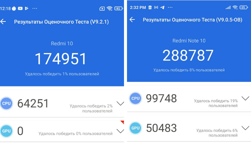 Redmi Note 10S (слева) и Redmi Note 10 (справа). Тесты в AnTuTu.