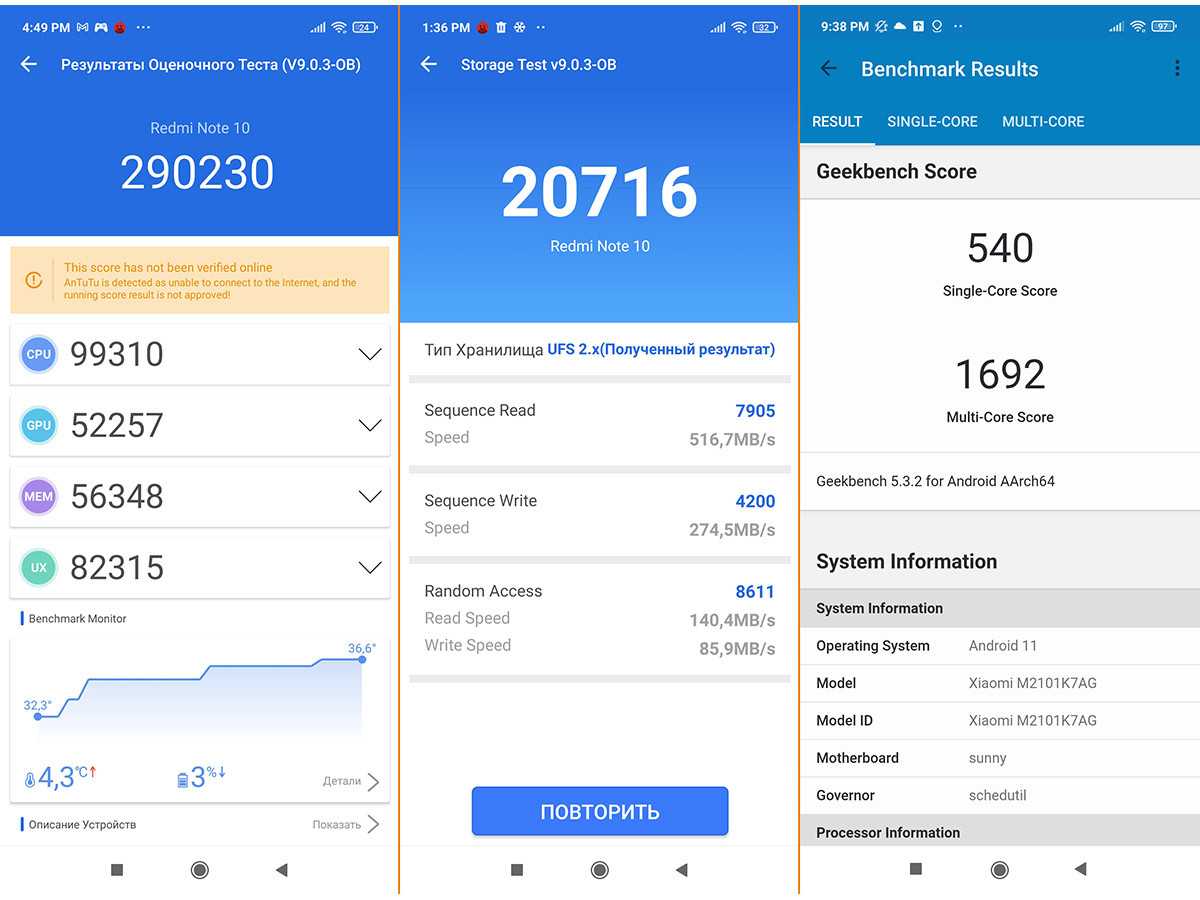 Результаты бенчмарка AnTuTu Benchmark 9 красноречиво говорят сами за себя, в общем зачёте уверенно побеждает Redmi Note 10 Pro, который стал быстрее и по чистой производительности ядер центрального процессора, и по графическому ядру. Единственный параметр, где он оказался медленее, это пропускная способность памяти, но как видим, это не помешало ему выиграть во всех остальных номинациях, Redmi Note 11 Pro разгромлен.