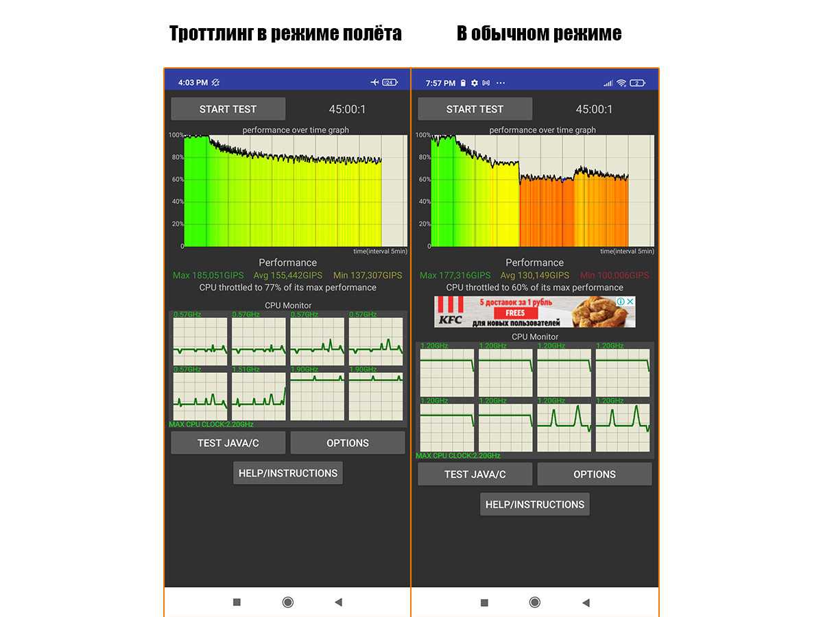 Приложение Trottling Test показывает, что возникает существенное снижение производительности во время тестирования при вставленной SIM-карте и с включенным Wi-Fi. С другой стороны, есть мнение, что тест лучше проводить в режиме полета, чтобы в софте не отображалась реклама, и ничто не влияло на результат. В этом случае смартфон уже не так сильно троттлит, и при реальных сценариях использования троттлинга нет.