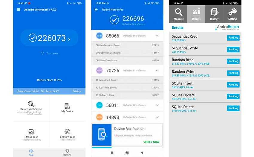 Производительность смартфона Redmi Note 8 Pro достаточно высока – как для использования стандартного функционала устройства, так и для запуска требовательных приложений. Почти все игры и графические редакторы работают идеально (за исключением самых новых мобильных игр на максимальных настройках), причем расклад объясняется как грамотным сочетанием компонентов сборки («железа»), так и высокими характеристиками отдельно взятых комплектующих.