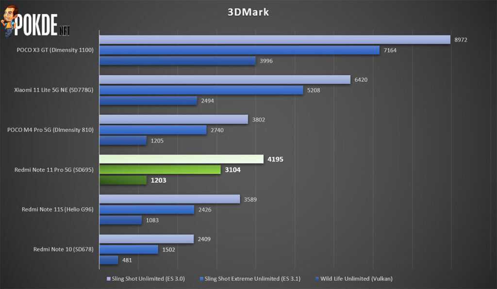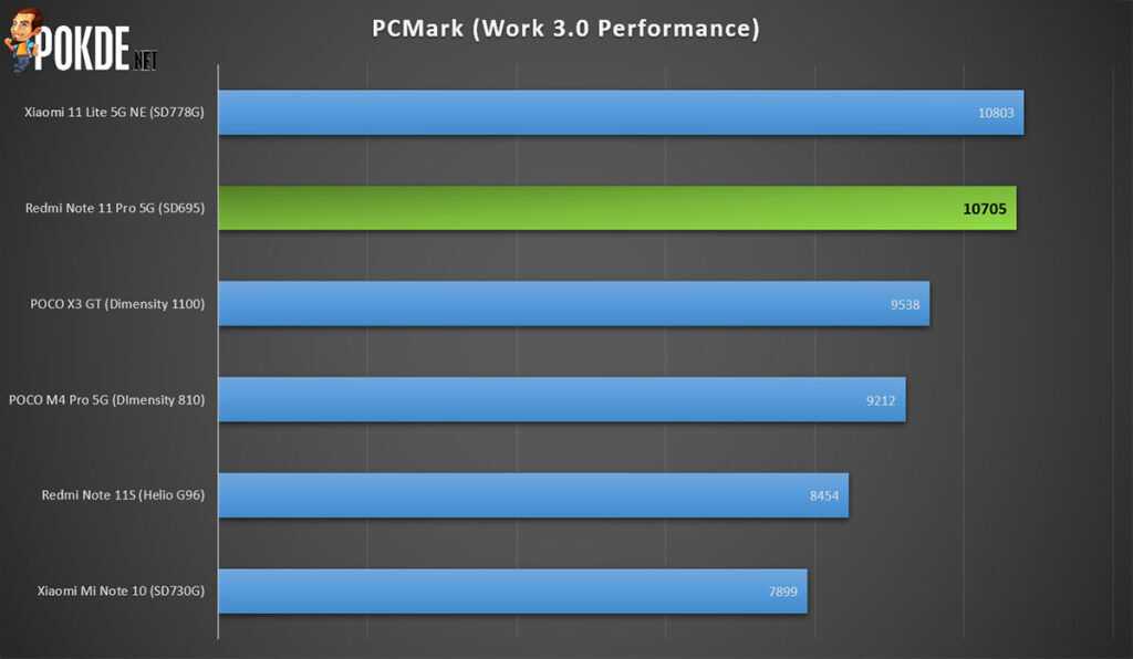 PCMark puts it right up there with the Xiaomi 11 Lite 5G NE, and well ahead of its peers. This indicates that the Redmi Note 11 Pro 5G is great for productivity tasks.