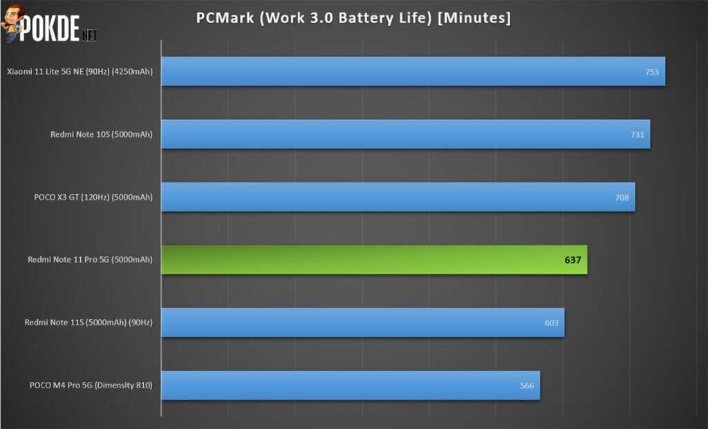 Interestingly enough, battery life is not really a strong suite of the Redmi Note 11 Pro 5G, despite the fact that it touts a rather efficiency-focused chipset. With the display running at 120Hz, it falls short of the other mid-range devices we have tested. 637 minutes in PCMark is still a respectable figure, but it could probably have been better, given the sheer size of the battery.