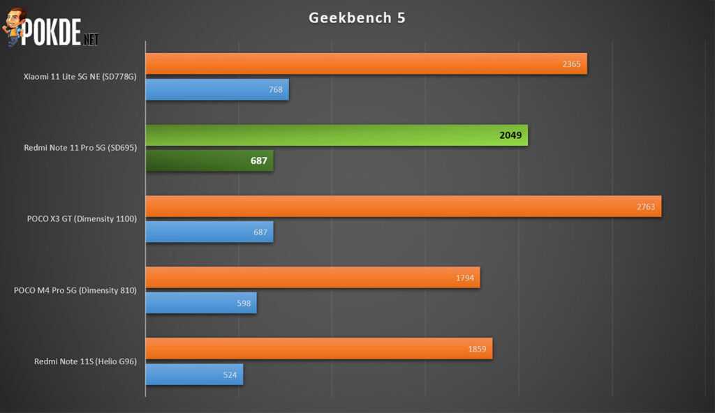 Geekbench 5 also sees the Redmi Note 11 Pro 5G outperform most of its peers, although we can see that the Snapdragon 695 once again meets all expectations of mid-range smartphone. The Xiaomi 11 Lite 5G NE outperforms the Redmi Note 11 Pro 5G with its higher-end Snapdragon 778G, most probably due to the fact that the more premium chipset touts more “performance” cores, rather than the efficiency-focused Snapdragon 695 which hosts more Cortex-A55 cores instead.
