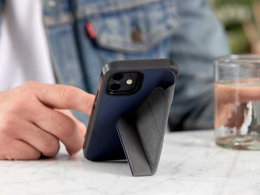 Задняя поверхность Origami Snap по желанию владельца превращается в подставку для смартфона, складываясь в разнообразных комбинациях.