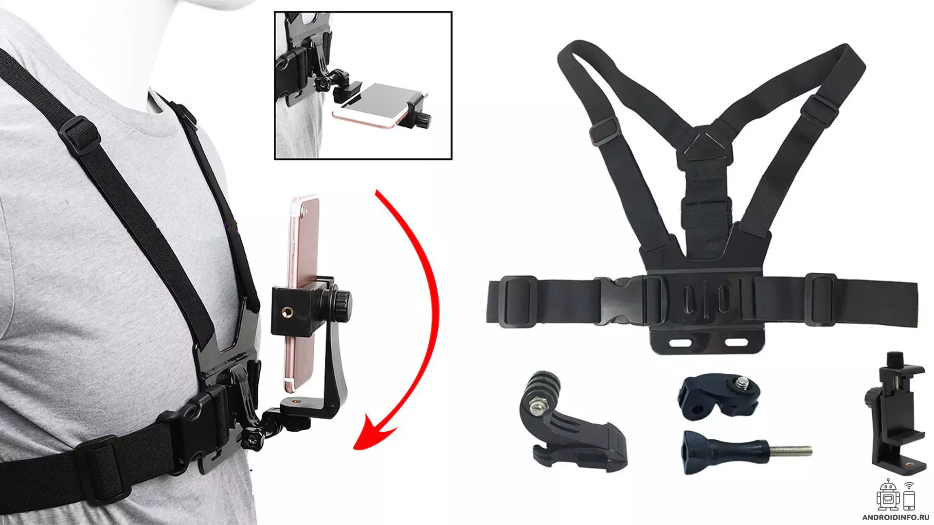 Если вы являетесь путешественником, туристом или блогером, подобный держатель для мобильного устройства однозначно вам необходим. В комплекте идёт нехитрая конструкция, состоящая из нескольких креплений и ремешков, соединённых в виде нагрудного жилета. Пользователю нужно собрать штатив, отрегулировать размер, и надеть на себя аксессуар, после чего можно закреплять телефон в предположенном для этого месте.