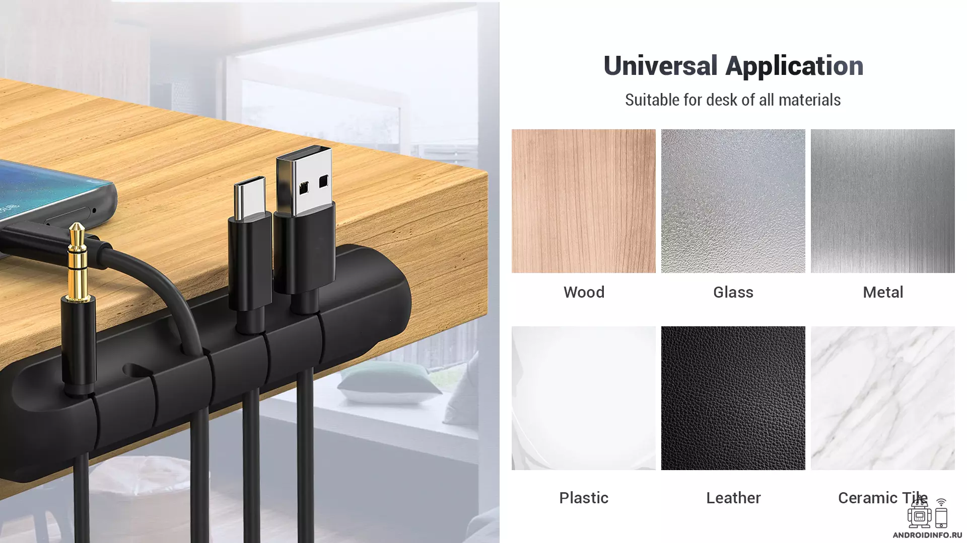 С помощью такой вещи, вы сможете моментально подключать к телефону наушники или зарядное устройство, а также передавать данные со смартфона на компьютер через USB. Продукт пригоден для эксплуатации на мебели, сделанной из дерева, стекла, металла, пластика, кожи или керамики. Также он отлично гнётся, что позволяет прикреплять его к неровным и угловым поверхностям.