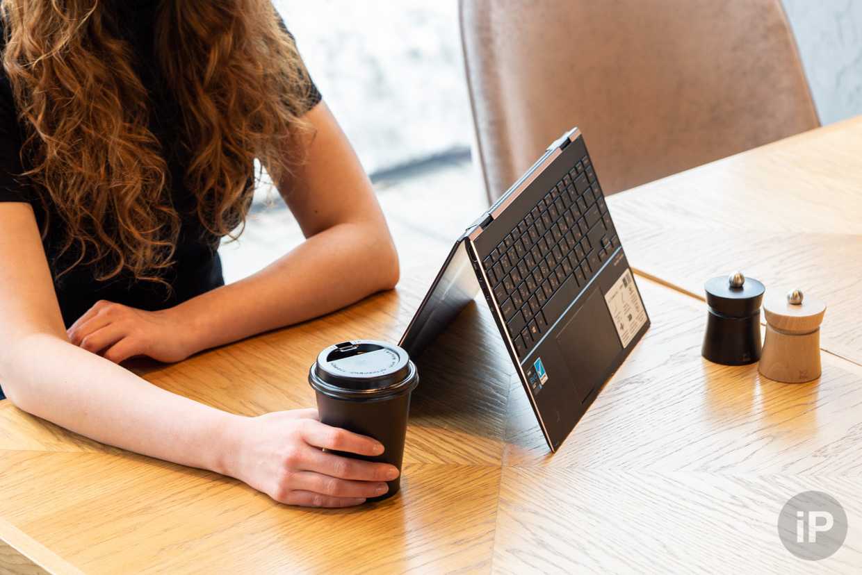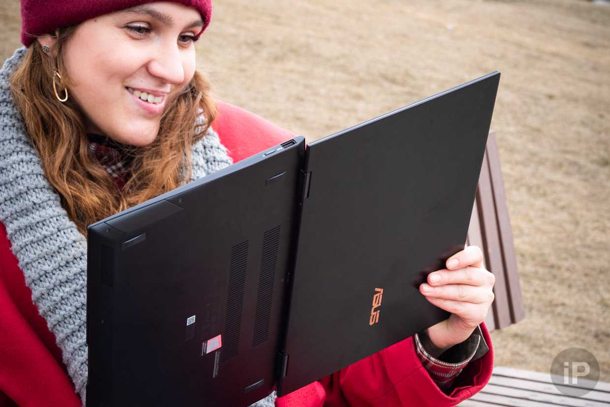 В такие моменты ZenBook Flip S можно поставить «домиком». Тут или экран будет к вам ближе, или место от клавиатуры будет свободным для ваших дел.