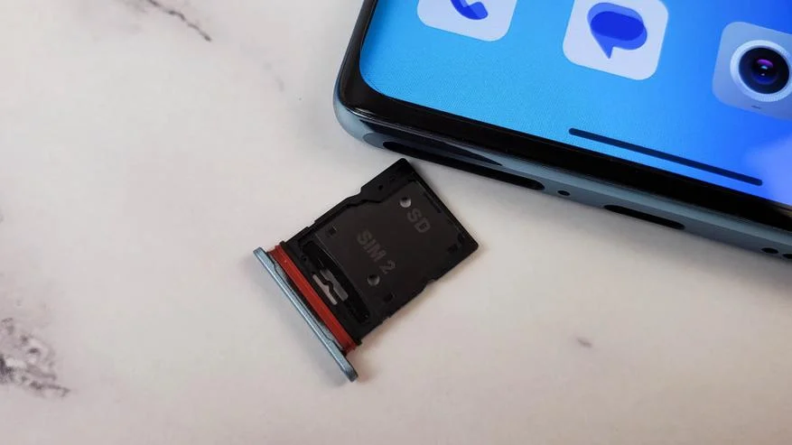 Здесь же расположен лоток. Он гибридный и поддерживает одновременную работу с двумя SIM, либо одна SIM + карта памяти micro SD