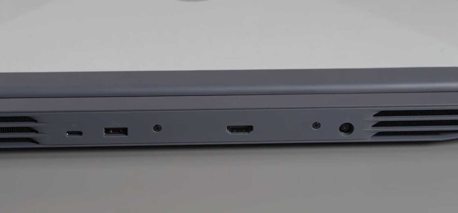 The hinge mechanism is represented by two small hinges firmly holding the display in position. The maximum opening angle of the screen is about 140 degrees. The keyboard is full-sized, with a digital block; it is a rather compact touchpad. Several interfaces are spaced along the side edges; others are on the case’s back. The laptop is upgradeable: after removing the bottom cover, you can access the RAM, SSD, battery, Wi-Fi, and fans.