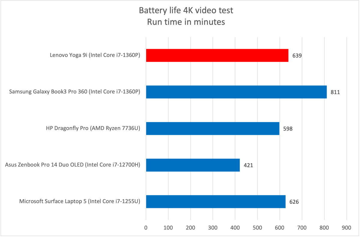 The Yoga Book 9i was the fastest in the pool on Handbrake, transcoding a 4K video to 1080p in 9 minutes and 19 seconds. The MacBook Air left the rest of the crowd in the dust at 7:52, and the P-Series Yoga 9i was actually slightly slower here at 9:45.