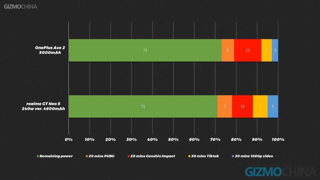 Сила Realme GT Neo 5 заключается в его мощном проводном зарядном устройстве мощностью 240 Вт, которое полностью зарядило аккумулятор устройства всего за 11 минут, что является самым быстрым зарядом, который мы когда-либо измеряли. Автономность, восстановленная после быстрой 5-минутной зарядки, также была впечатляющей, обеспечивая в среднем 16 часов и 21 минуту, что на 5 часов больше, чем у предыдущей лучшей быстрой зарядки.