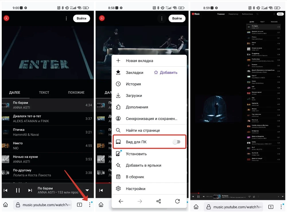 Просто сделайте это, и видео, и, что более важно, звук будут продолжать воспроизводиться даже после выключения экрана или перехода на другое приложение. Шаги в браузере Chromium (например, Chrome, Opera или Яндекс) или Safari немного отличаются, но результат тот же