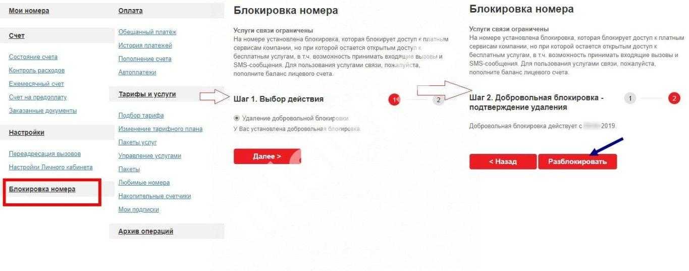 - для разблокировки потребуется позвонить в службу поддержки, зайти в салон или снять блокировку через Личный кабинет.