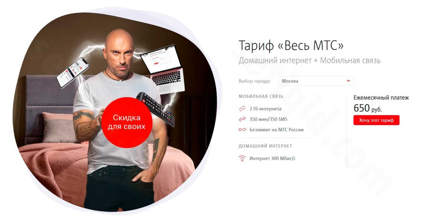 Есть стандартный тариф «Весь МТС», который считается начальным предложением данной линейки. Он рассчитан на большинство пользователей.